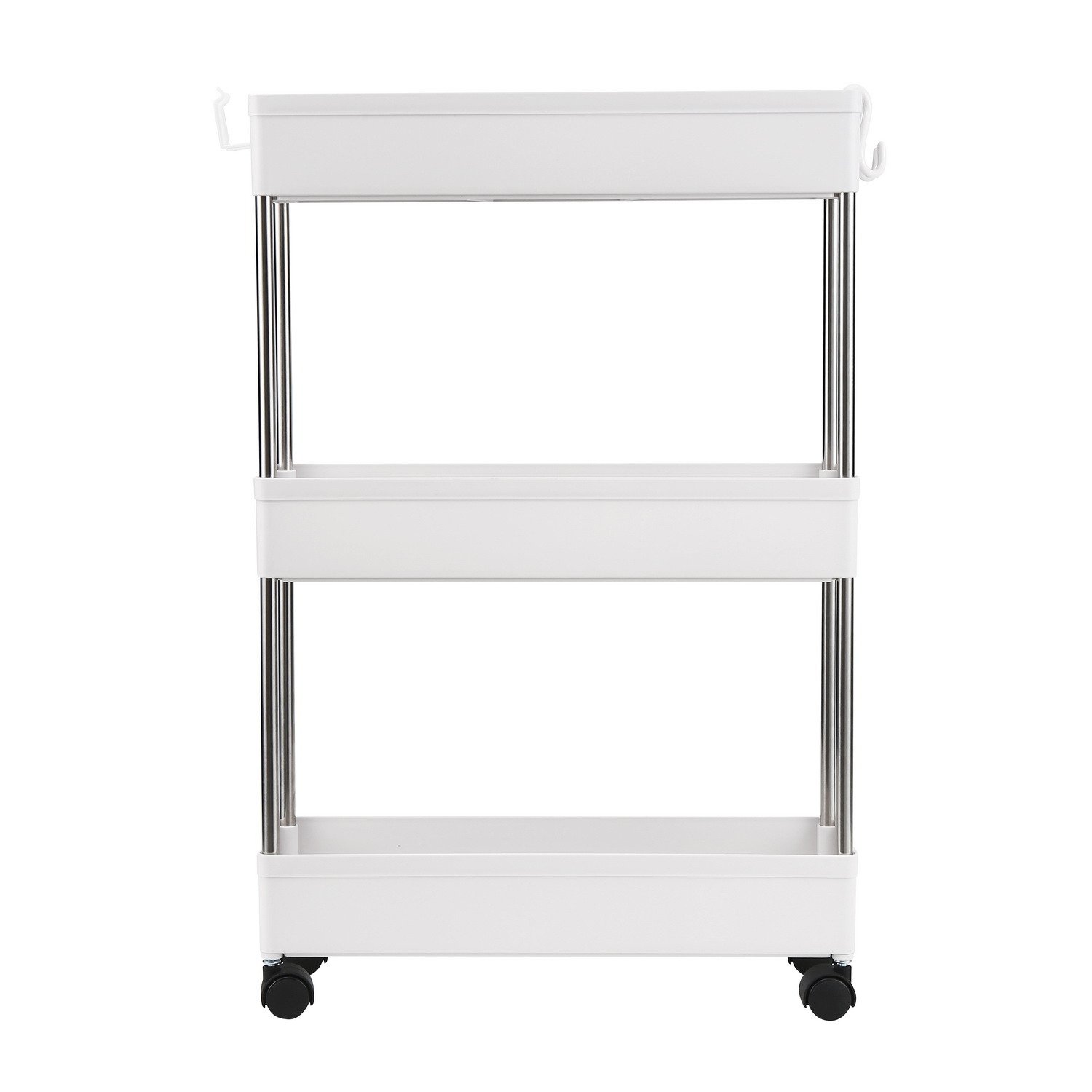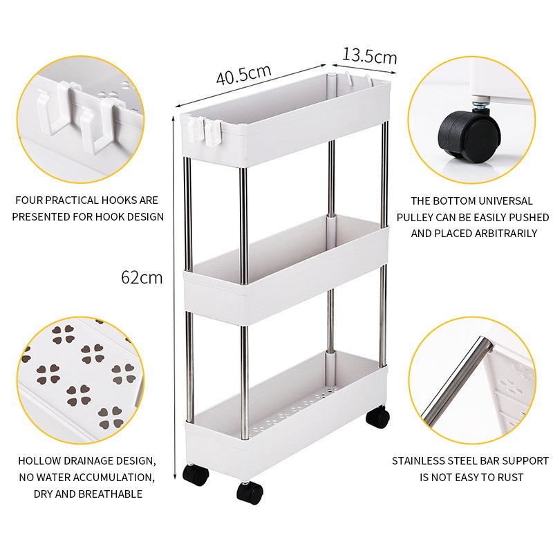 Features:1. The 3-storey ultra-thin structure design of shopping cart can be placed in any small space in your home, including closet, kitchen, bathroom, garage, laundry room, office or between washing machine and dryer2. Shopping trailer with 4 pulleys, convenient for you to use them anytime and anywhere, and no effort, simple and no space3. It is made of high-grade plastic and stainless steel, durable and stable. Mesh design gives it a modern appearance. The plastic surface is integrated with the office decoration, and the installation process is easy to understand, easy to assemble and easy to maintain4. The shopping cart also has 4 hooks on the forehead, which can meet the needs of other items when you store large products. The storage capacity is very strong