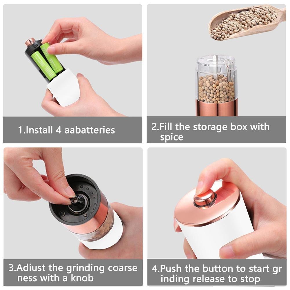 2. One-handed operation: Unlike manual grinders; this battery-powered grinder can be operated with one hand; so you can free up one hand for stirring or tossing. Just press the soft button on the top of the grinder. Very helpful for arthritis sufferers.