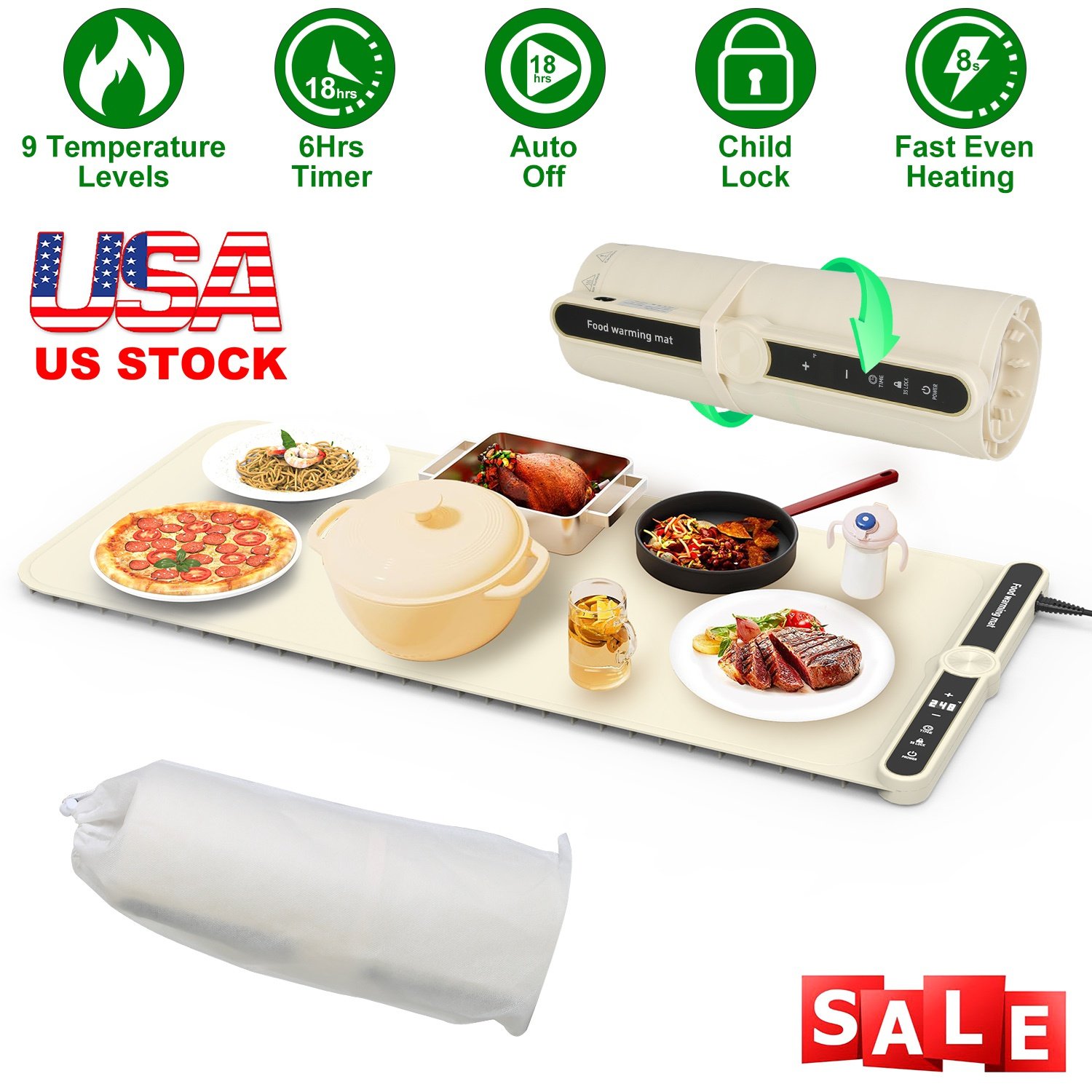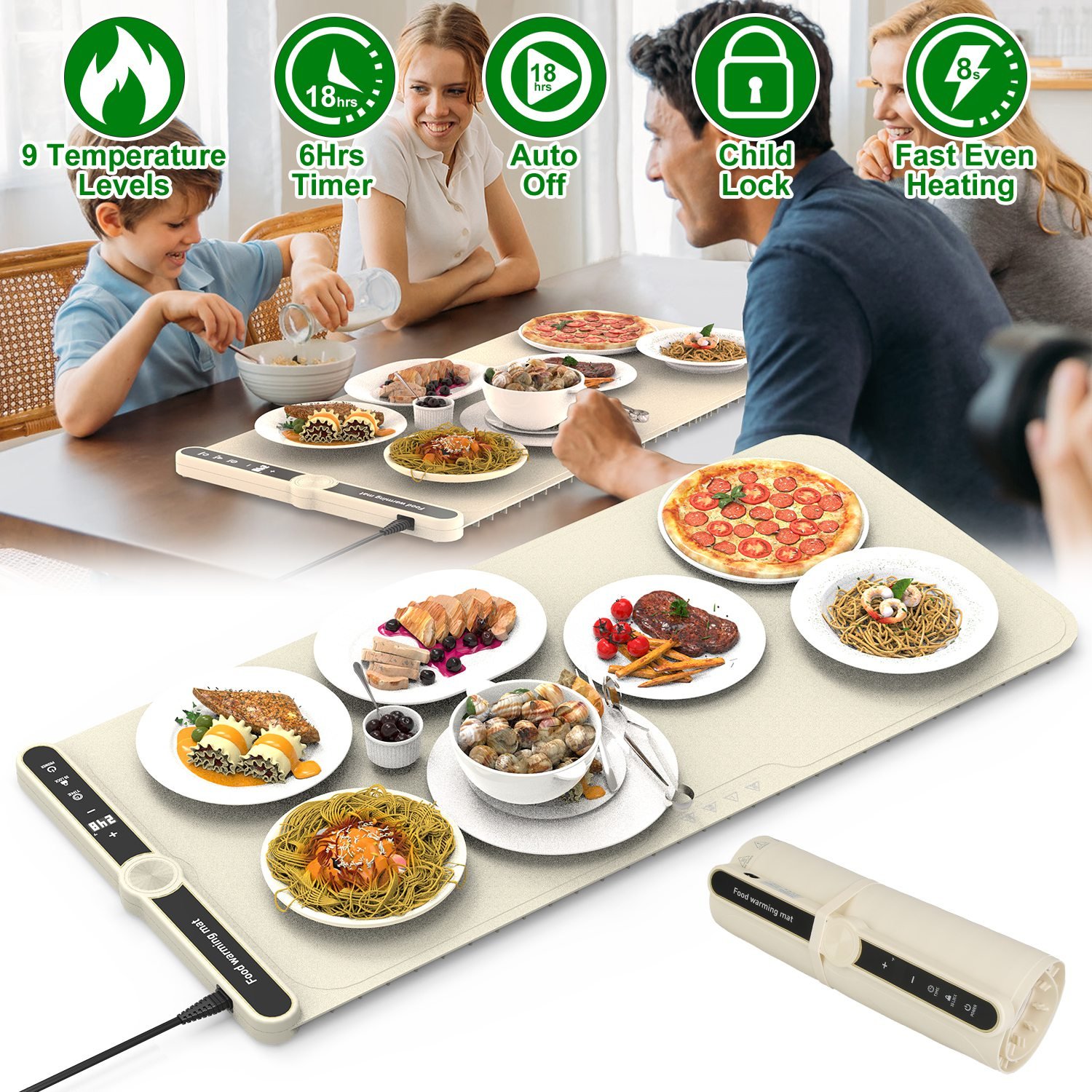 Whether it\'s family gatherings, festive celebrations, social dining, parties, buffets, or travel, this food warming mat is your ideal companion for keeping your dishes warm and ready to be savored. Advanced heating wires that cover the entire bottom enables quick and comprehensive heating. With 9 levels of temperature setting, you have full control over the heating level of your dishes. Smart timer function and auto-off protection keep you reassured when forgetting to turn off or unplug. Child lock protection ensures that your little ones stay safe around the warming mat. Suitable for a various types of tableware and widely used when it comes to facial masks, thawing, dough fermentation and dinner leftovers heating.