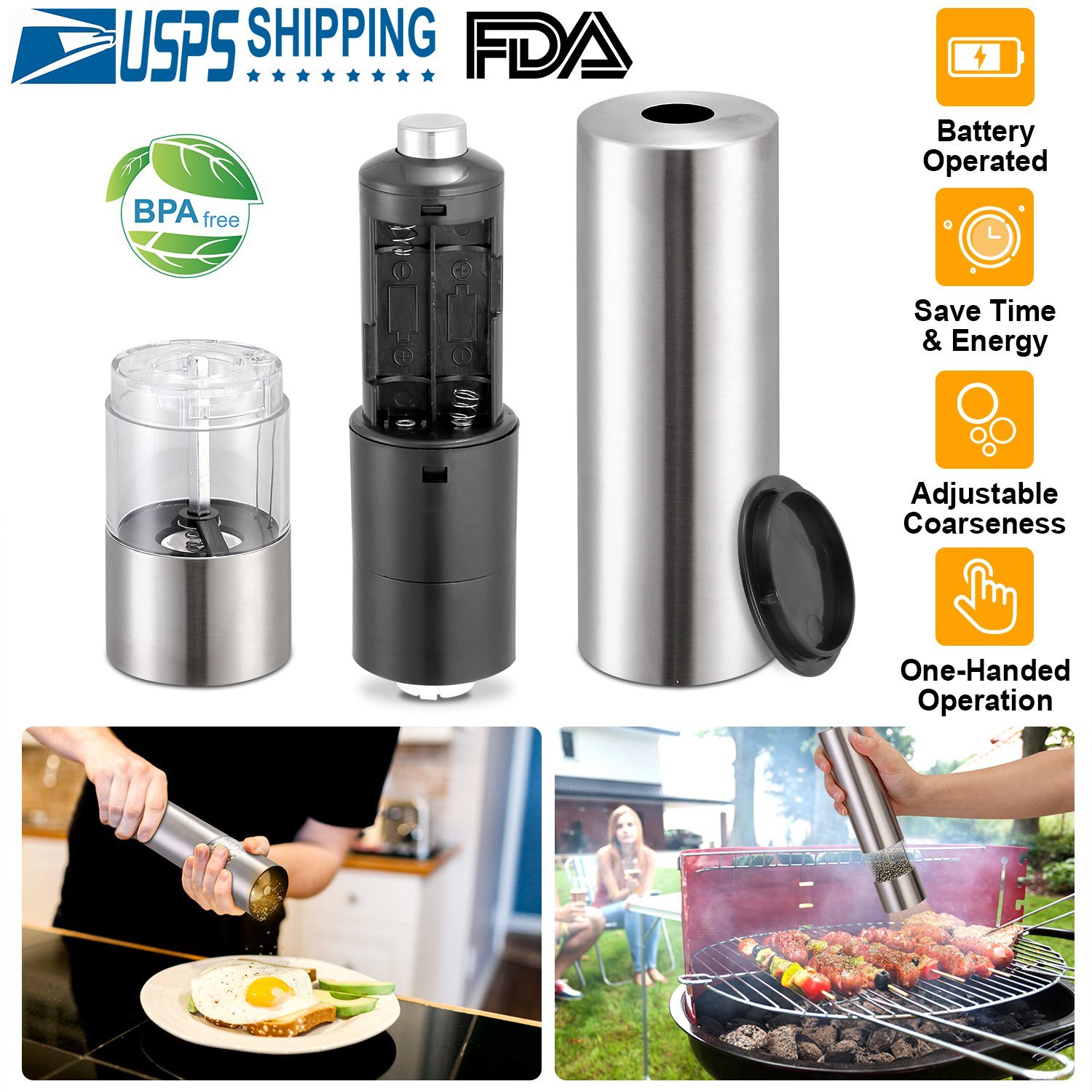 Still manually grind pepper, which waste time and energy? Our electric salt & pepper grinder is battery operated to save your time and energy, incredibly easy to use with their smart one-hand design so you can season your food with just the push of a button. Also it\'s economical and practical, ideal for cooking in the kitchen and grilling BBQ outside. Meanwhile, made of the highest quality stainless steel and BPA-free acrylic glass, which is safe to use and also a stylish addition to your kitchen and dinner table. Feature coarseness adjustment, which makes it easy to adjust the coarseness for perfect grind and seasoning.