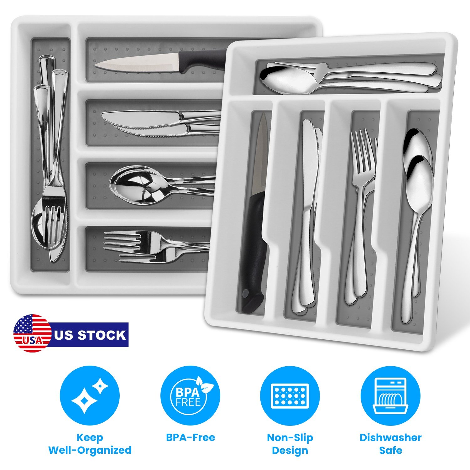 Are you tired of wasting time to find what you want in the messy drawer? Our 2pcs silverware organizers with 5 individual compartments are especially designed to help you keep knives, spoons, forks, ladles or other gadgets in well order. Made of thickened BPA-free plastic, high-temperature resistant, durable, supports dishwasher washing. Not only suitable for storing kitchen supplies, but also can be used to organize various pens in study room, tools in garage, makeup in bedroom. Ideal and affordable household organizer to keep your house tidy and clean.