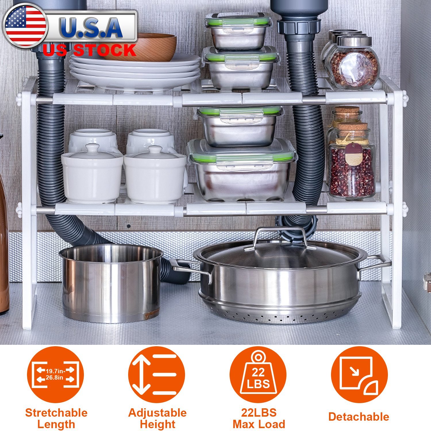 2-Tier Under Sink Organizer Retractable Kitchenware Rack Holders Space Saving Storage Shelf 22LBS Max Load